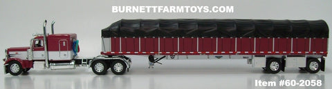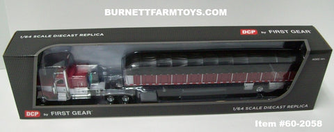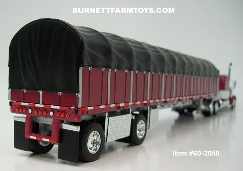 Item #60-2058 Burgundy White Black Outline Peterbilt 389 63-inch Flattop Sleeper with Burgundy Sided Black Tarp Silver Frame Spread Axle Wilson Roadbrute 53-foot Flatbed Covered Wagon Trailer - 1/64 Scale – DCP by First Gear