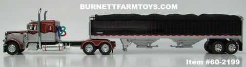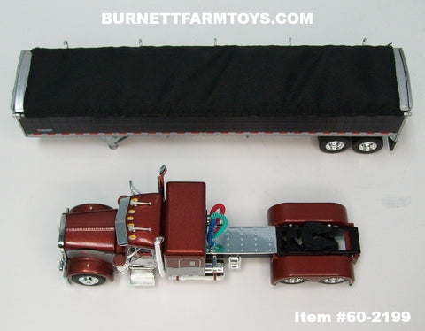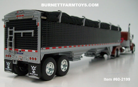 Item #60-2199 Burnt Orange Metallic Silver Black Outline Peterbilt 379 48-inch Flattop Sleeper with Black High Sided Black Tarp Silver Frame Tandem Axle Wilson 43-foot Pacesetter Hopper Bottom Grain Trailer - 1/64 Scale – DCP by First Gear