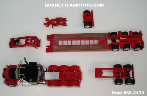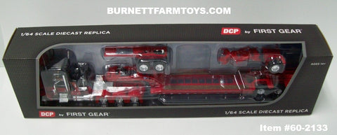 Item #60-2133 Black Red Burgundy Gold Outline Tri-Axle Peterbilt 389 36-inch Flattop Sleeper with Red Tri-Axle Heavy Haul Fontaine Magnitude Lowboy Trailer with Jeep and Stinger - 1/64 Scale – DCP by First Gear