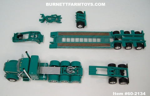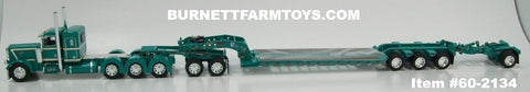 Item #60-2134 Teal Cream Black Outline Tri-Axle Peterbilt 389 36-inch Flattop Sleeper with Teal Tri-Axle Heavy Haul Fontaine Magnitude Lowboy Trailer with Jeep and Stinger - 1/64 Scale – DCP by First Gear