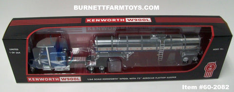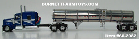 Item #60-2082 Blue White Silver Outline Kenworth W900L 72-inch AeroCab Sleeper with Polished Silver Tandem Axle Brenner Banded Tanker Trailer - 1/64 Scale – DCP by First Gear