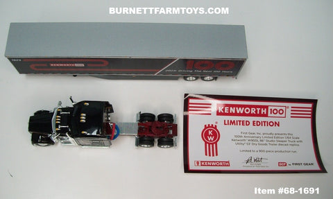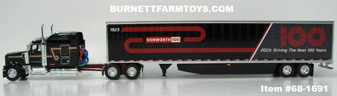 Item #68-1691 Kenworth 100th Anniversary Black Burgundy Gold Stripe Kenworth W900L 86-inch Studio Sleeper with Tandem Axle Utility 53-foot Dry Goods Van Trailer with Skirts - 1/64 Scale – DCP by First Gear
